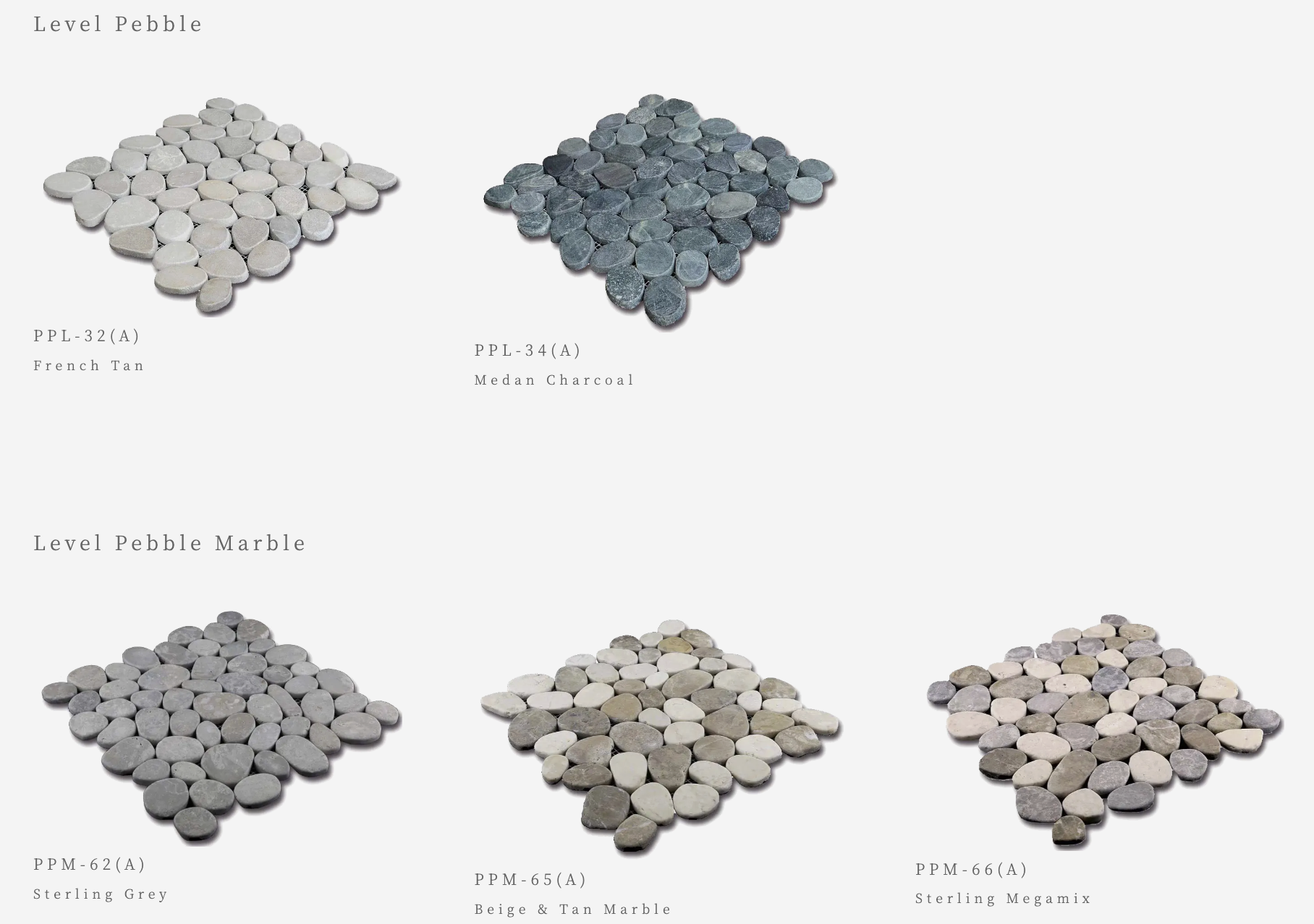 インドネシアやインドで採石された天然石のつるりとした肌ざわりが心地よく、素足で過ごしたくなるタイルです。表面を削って平らにしたタイプと丸石の丸みを活かしたタイプ、二種類あります。玄関の土間、店舗のエントランスには平らなタイプ、丸いタイプはサロンや洗面所の床に使うと素足にも気持ち良いですねw